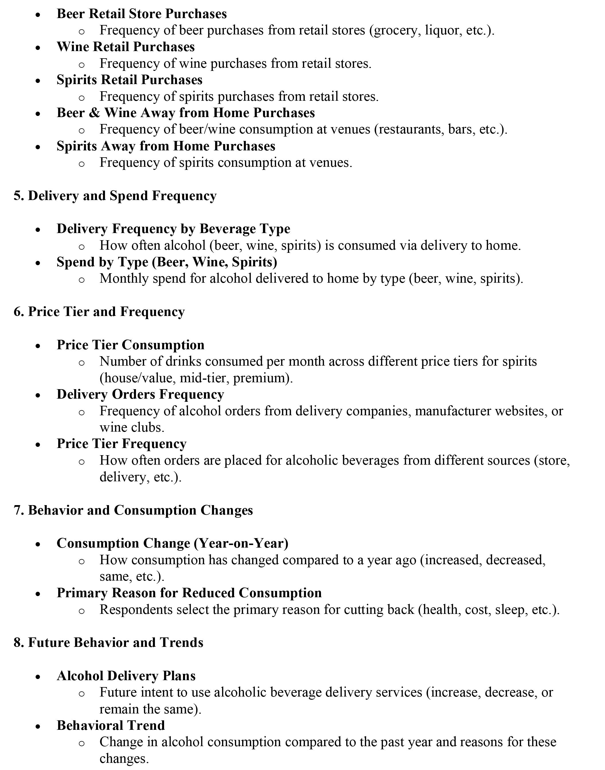 Our quarterly Bev-Al Consumer Survey questionnaire was deployed to 2,000 adults of legal drink age, balanced for gender, household income, and geographical location. This survey examined consumption frequency, dollar spend and behaviors by categories, subcategories, premise, and home delivery.